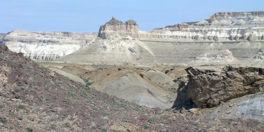 Ustyurt Nature Reserve contains a big variety of landscapes, from steppes and depressions to pillars reaching several hundred meters in height. The pillars can be several colors, including pale pink, blue and dazzling white. The vast Kenderlisor depression spans the entire length of the reserve, from the southwest to the northeast. Shakhr-i-Vazir, an ancient city, also lies in the reserve, along with dozens of Neolithic sites.
