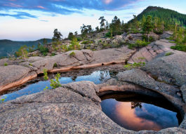 The forests within the park are made up of pine, birch, poplar, willow, and juniper trees. 71.3% of the wooded area in the park are pine trees. Birch forest occupies 10% of the wooded area and aspen forest takes up 2%. The underbrush of the park includes Cossack’s juniper, Tatar’s honeysuckle, and other plants. Shrubs occupy 34% of the total area of the park. There are 87 kinds of medicinal, oil bearing and alkaloid plants in the Karkaraly Mountains.