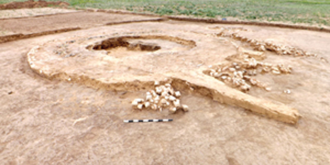 В 2013 году на территории городища Жайык была сделана ещё одна очень важная находка. Археологи раскопали мавзолей, который имеет очень необычную, редкую коническую форму, заканчивающуюся круглым сводом, который в целом представляет собой пирамидальную форму. Памятник обложен жженым кирпичом и имеет очень толстые стены у основания шириной 2 метра 15 см. К сожалению, он плохо сохранился, отчетливо видно только само подножие. Столь плохая сохранность сооружения объясняется тем, что поверхность городища в этой части неоднократно нарушалась, использовалась под сельхозугодия, распахивалась. По всему периметру мавзолей огорожен от внешнего мира 40-50 метровой стеной из сырца, который сделан в форме квадратов. Разбросанные в разных местах кости скелета человека говорят о том, что памятник был разграблен. Перед входом в сооружение было установлено пять столбов, кулпытасов, которые, по всей видимости, несли религиозную нагрузку: сакральное пространство, место святилища, поклонения людей. Коническая форма мавзолея свидетельствует о связи ислама с кочевой культурой.