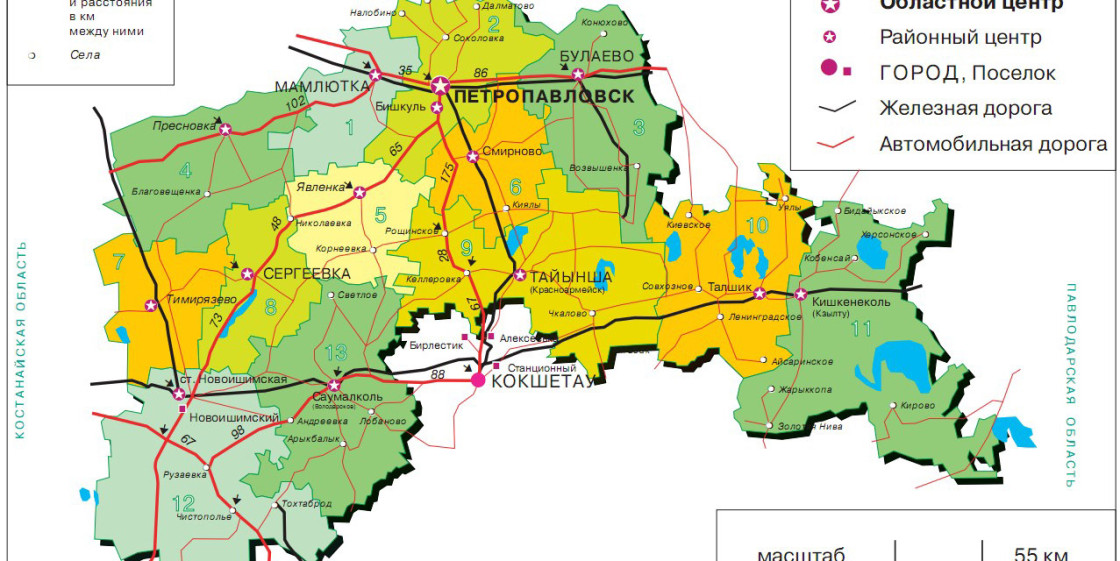 Облыста 13 әкімшілік аудан бар; 5 қала – Петропавл, Булаев, Мамлют, Тайынша, Сергеев; 4 қала типтес кенттер – Смирново, Талшық, Еңбек, Кішкенекөл.