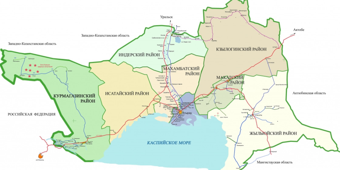Атырауская область граничит с Западно-Казахстанской областью, Мангистауской областью, Актюбинской областьюи Астраханской областью Российской Федерации.