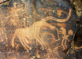Распространенным сюжетом во время создания ранних петроглифов является преследования козлов собаками. Эти петроглифы отличаются удивительной экспрессией. Изображения лишены условности и декоративности, однако черты "звериного стиля" уже угадываются в гравировках.